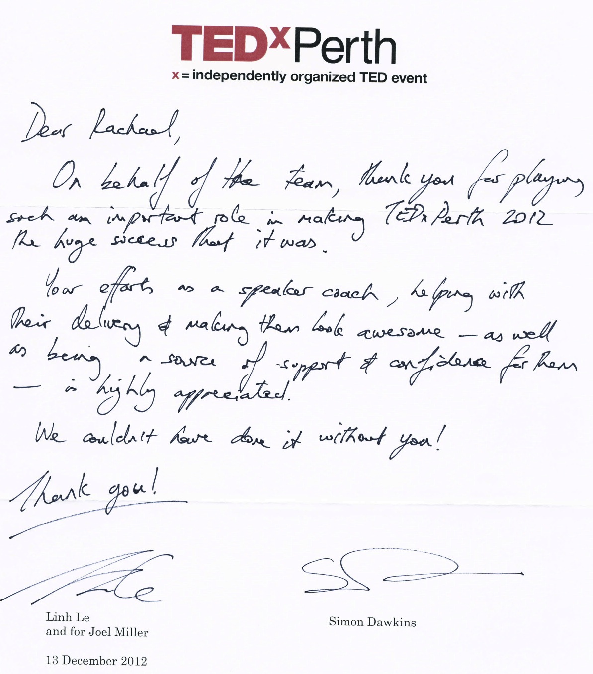 “ Rachael, you were fantastic in assisting me in my preparation and asking the hard questions (in a kind way!). You instigated great self-reflection and provided me with tips and tricks that made being up in from of 1000 people seem like a piece of cake! The skills you introduced me to have already come in handy in other work situations & I now know where to go if I need future assistance or want to refer someone on to enhance their public speaking skills.”